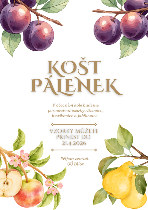 I v letošním roce proběhne obecní kolo koštování pálenek. Kdo chce porovnat své výtvory z loňského roku, nechť přinese svůj vzorek, v množství 0,2l na obecní úřad do 21.4.2026. Budeme porovnávat vzorky SLIVOVICE, HRUŠKOVICE, JABLKOVICE.