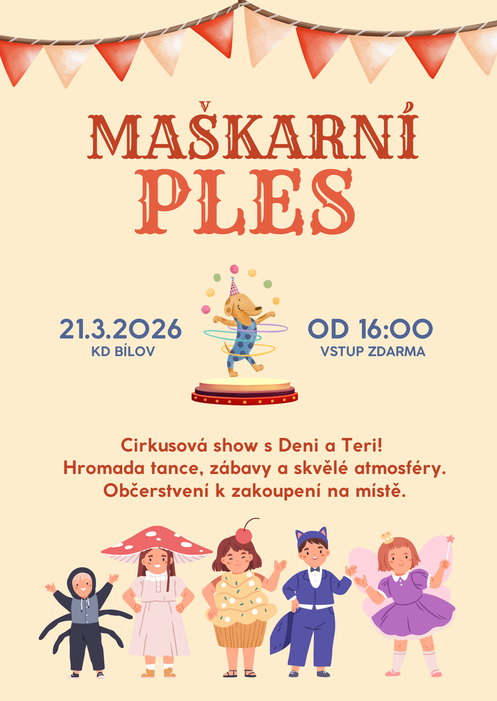 Srdečně zveme všechny děti, jejich rodiče i prarodiče na maškarní ples do Bílova. Čeká vás cirkusová show s Deni a Teri, hromada tance, zábavy a skvělé atmosféry. Těšíme se na všechny v sobotu 21.3.2026 v 16:00 v kulturním domě Bílov.